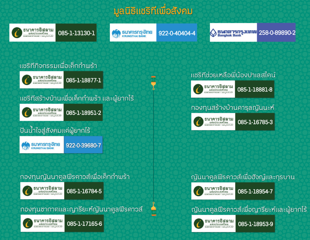 มูลนิธิแชริทีเพื่อสังคม ดำเนินงานที่เกี่ยวข้องกับการช่วยเหลือสังคมและมนุญยธรรมในหลายๆด้าน อาทิ เช่น การช่วยเหลือเด็กกำพร้า ผู้ที่มีฐานะยากจน อนาถา ผู้พิการ ผู้สูงอายุ ผู้ประสบภัยพิบัติ ผู้ด้อยโอกาส และผู้ประสบเหตุไม่พึงประสงค์ต่างๆในพื้นที่จังหวัดนราธิวาส จังหวัดปัตตานี และจังหวัดยะลา โดยการระดมทุนจากภาคีสนับสนุนและผู้ใจบุญท้ังในและนอกประเทศ ซึ่งสามารถแบ่งตามแต่ละวัตถุประสงค์ โดยผู้ที่สนใจร่วมบริจาคเพื่อภารกิจงานช่วยเหลือสังคมสามารถโอนเงินสนับสนุนการดำเนินงานได้ตามเลขที่บัญชีดังต่อไปนี้