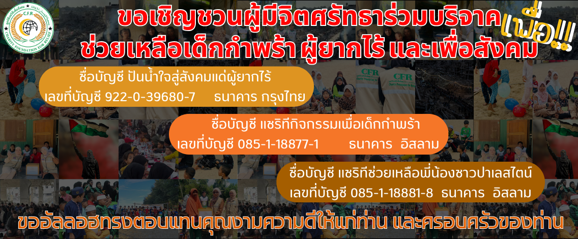 เพื่อเธอ ปาเลสไตน์ ขอเชิญชวนพี่น้องร่วมทำบุญบริจาคเงินเพื่อพี่น้องมุสลิมที่ถูกอธรรมในดินแดนปาเลสไตน์ เพื่อมนุษยธรรม โดยท่านสามารถร่วมบริจาคได้ที่ ธนาคารอิสลาม เลขที่บัญชี : 085-1-18881-8 ชื่อบัญชี : แชริทีช่วยเหลือพี่น้องปาเลสไตน์ #ขออัลลอฮประทานผลบุญให้กับท่านในโลกนี้และโลกหน้า อามีน… จำนวนผู้เข้าชม : 80