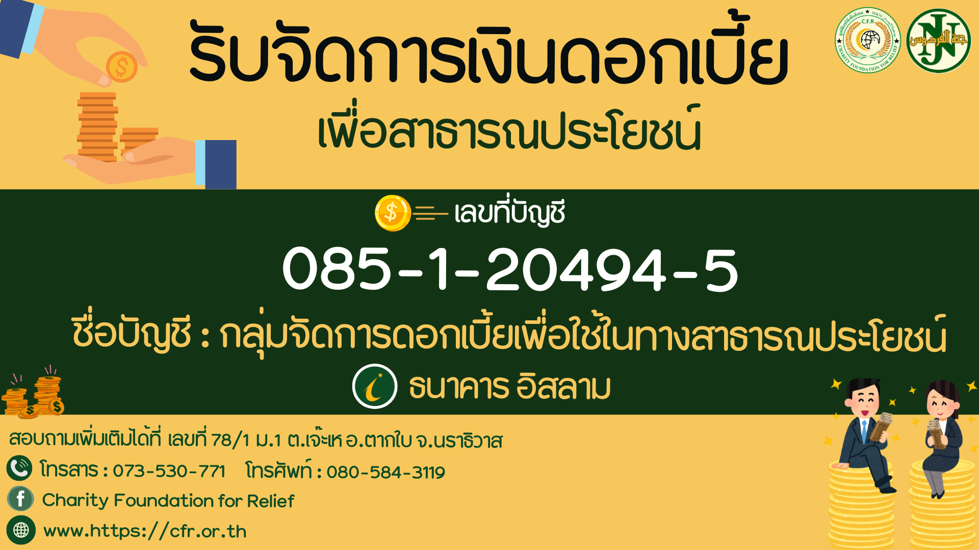 ดอกเบี้ยเป็นสิ่งต้องห้ามในอิสลาม เผลอปล่อยไว้นาน เราอาจจะเผลอไปใช้ประโยชน์เงินดอกเบี้ยได้ ดังนั้นอย่ารอช้าที่จะจัดการดอกเบี้ยนะคะ มูลนิธิแชริทีเพื่อสังคมรับจัดการเงินดอกเบี้ยของท่าน เพื่อกิจการสาธารณประโยชน์ สร้างห้องน้ำ และอื่นๆ จำนวนผู้เข้าชม : 167